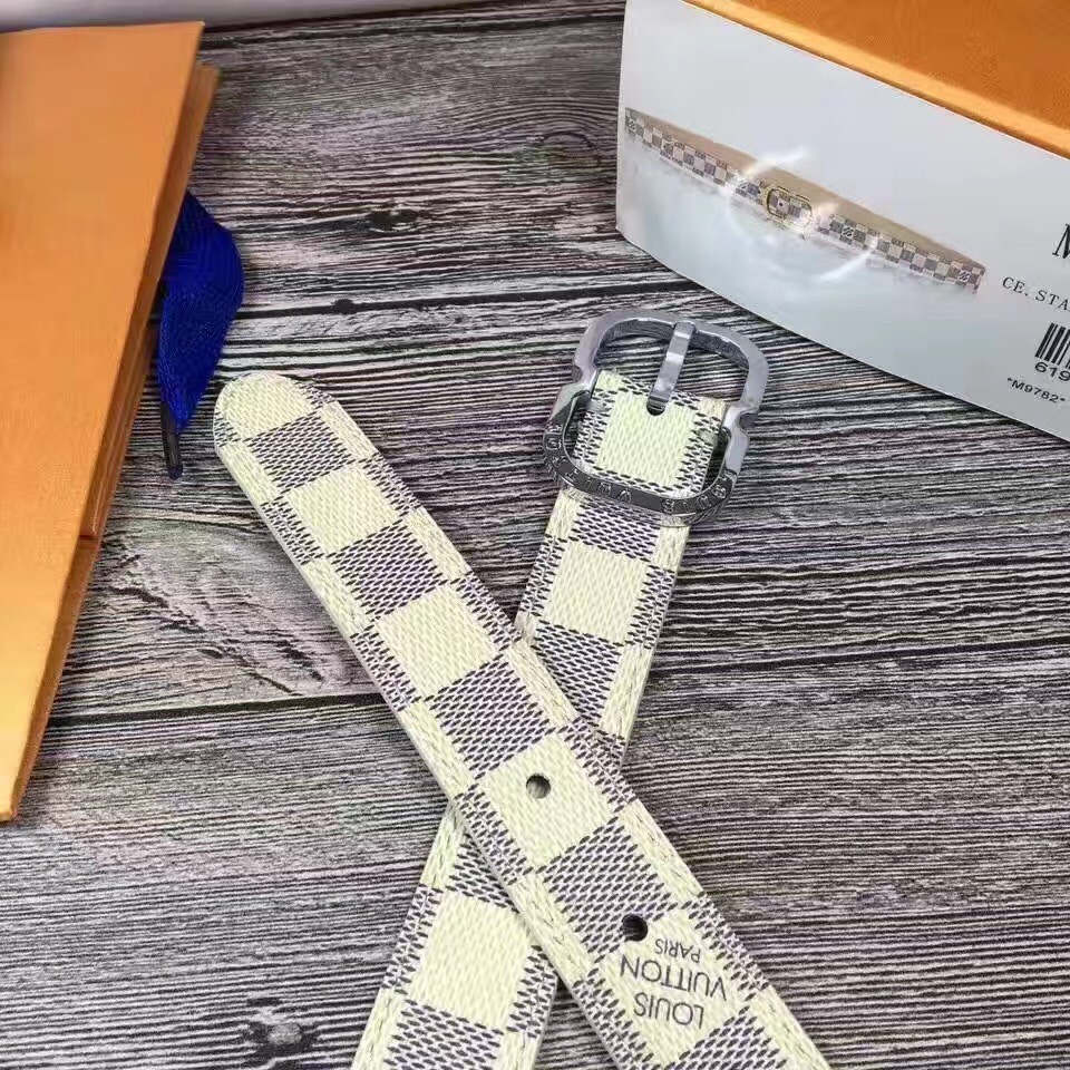 说明:时尚而极富女人味的 Mini 腰带采用了缩小版的路易威登经典 Damier 帆布,与对称弧线设计的细长金色金属带扣相得益彰